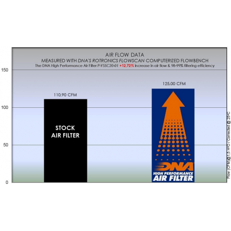 Η ροή αέρος του φίλτρου ξεπερνάει κατά +9.85% το εργοστασιακό φίλτρο. Πιο αναλυτικά:- Ροή αέρα εργοστασιακού Φίλτρου: 113.80 CFM(Cubic feet per minute) @1,5”H2O corrected @ 25degrees Celsius - Ροή αέρα φίλτρου DNA: 125.00 CFM(Cubic feet per minute) @1,5”H2O corrected @ 25degrees Celsius